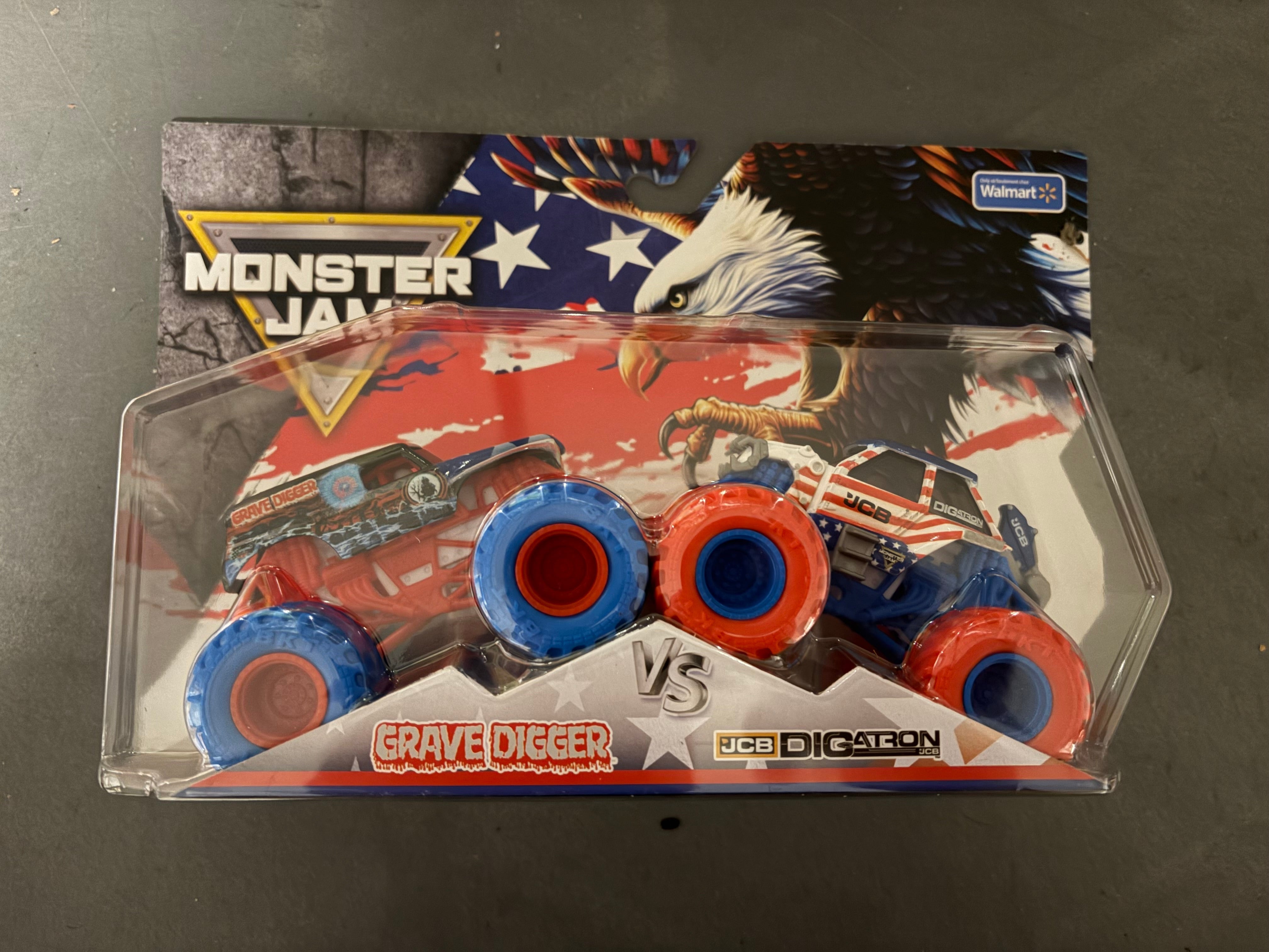 MONSTER JAM WALMART STARS STRIPES 2 PK GRAVE DIGGER JCB DIGATRON